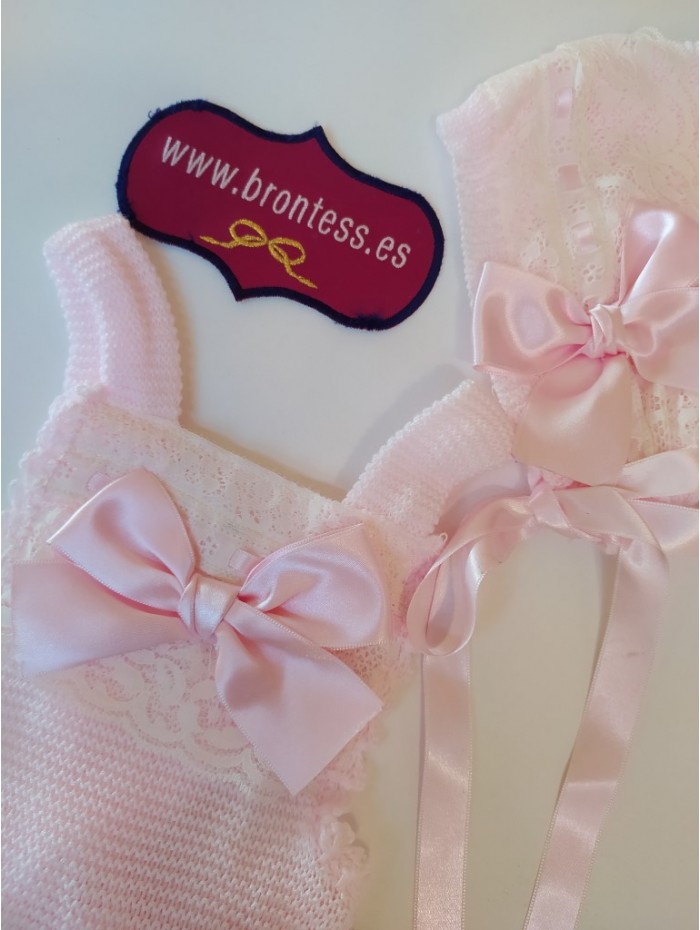 Conjunto de punto en tono rosa para bebe compuesto por ranita de tirantes y capota