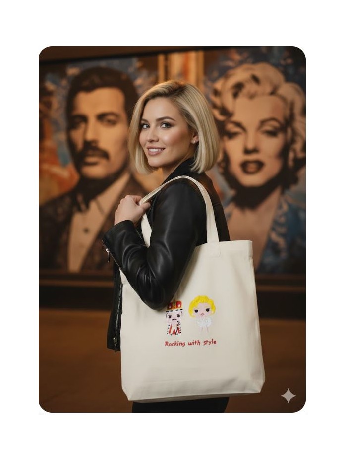 Bolsa confeccionada en tejido de algodón color crudo con forro interior. Dispone de bolsillo. Bordado de Freddie Mercury y Merilyn Monroe.