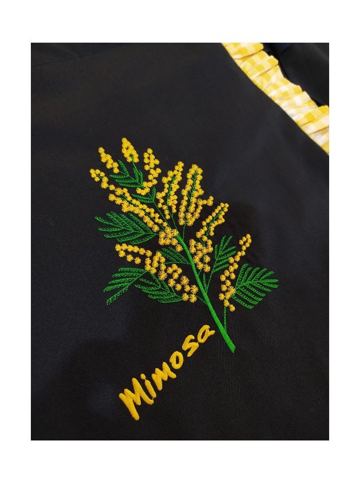 Bolsa para colgar al hombro confeccionada con tejido negro , interior con forro y bolsillos, adornada con volantes de cuadros amarillo en los costados y bordado central