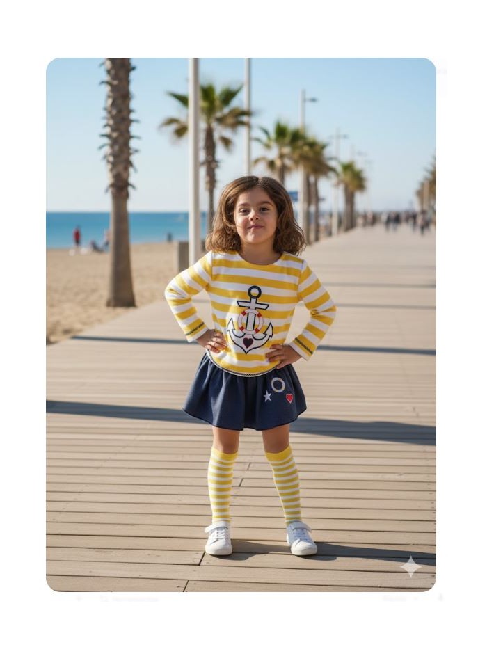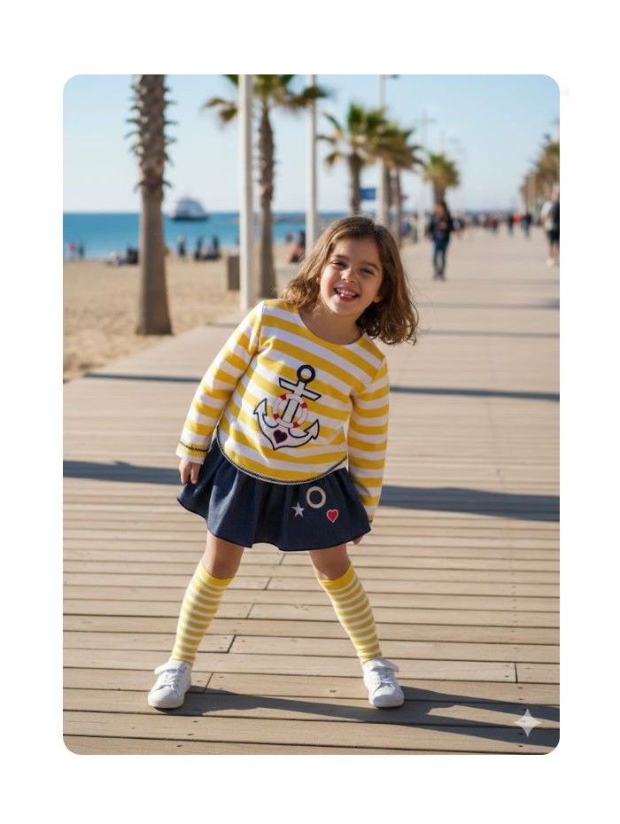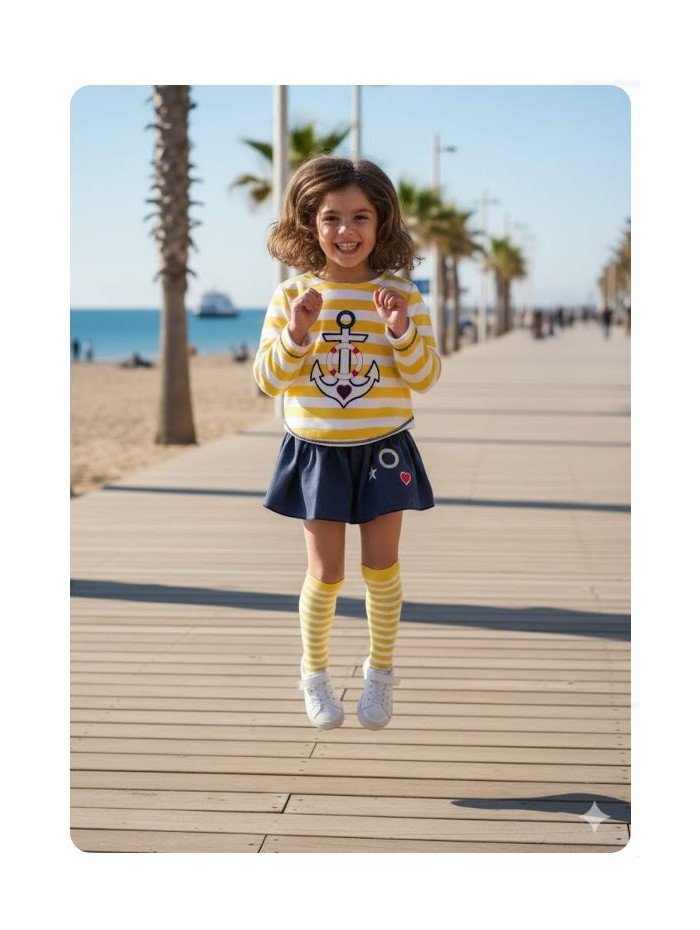 Conjunto para niña de sudadera marinera con rayas amarillas y braga falda