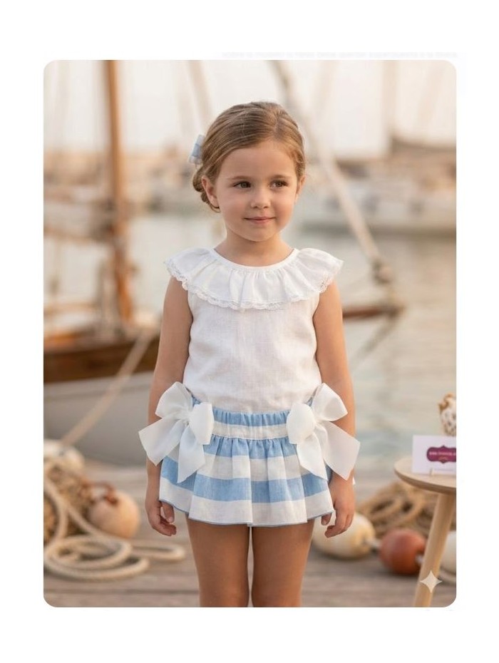 Conjunto compuesto por blusa en tono marfil y braga falda de rayas azules.