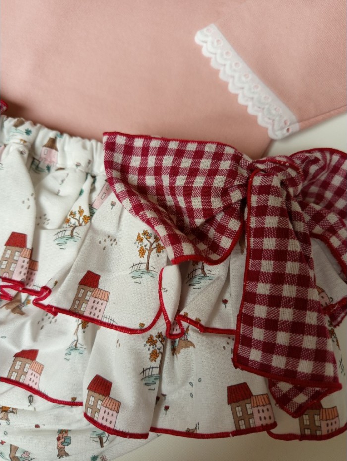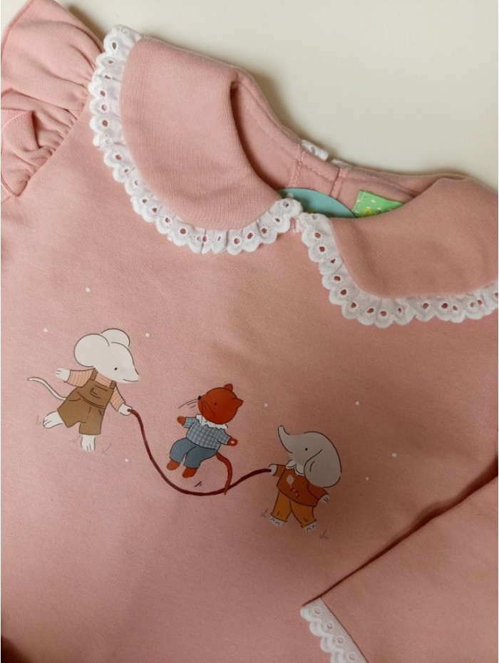 Conjunto compuesto por sudadera en tono rosa con estampación de animales jugando a la comba y braga con volantes efecto falda, de la firma Pio pio