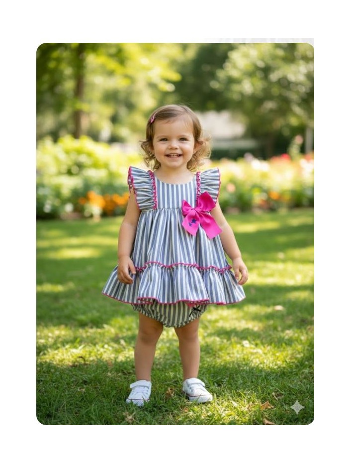 Jesusito, vestido de verano para niña con braga a juego, ambas prendas con forro, cierre con botones en la espalda, escote redondo y corte sobre el pecho. Adornado con volantes sobre los hombros rematados con filo fucsia al igual que el volante del bajo, forro interior también con volante. Sobre el pecho lazo bordado con estrellas. Detalle bordado en la braga.