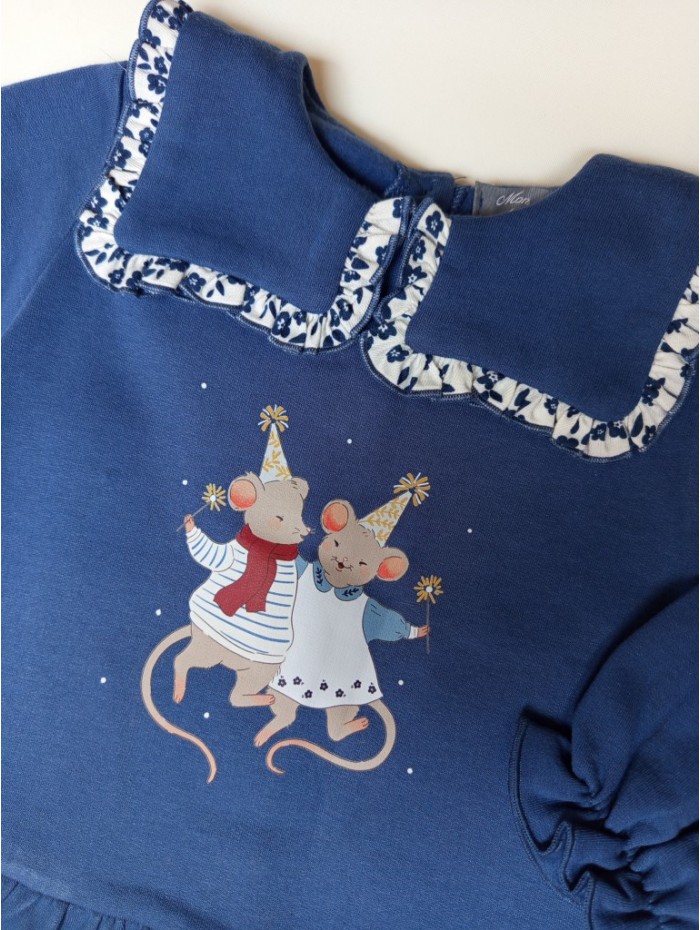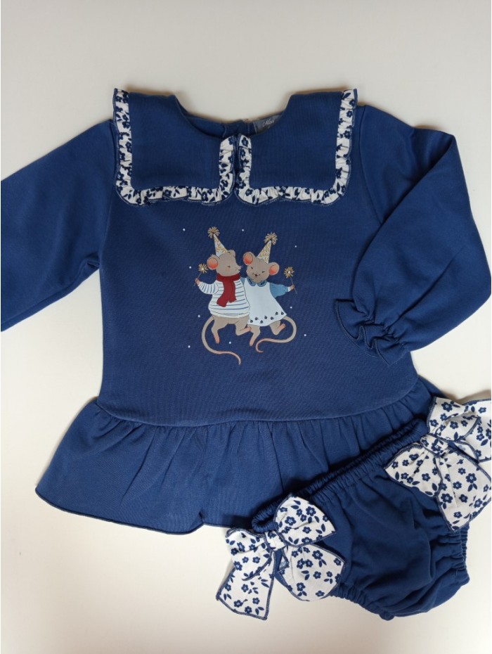 Jesusito, vestido para niña con braga a juego, confeccionado con tejido de felpa en tono azul de la firma Mon petit bonbon