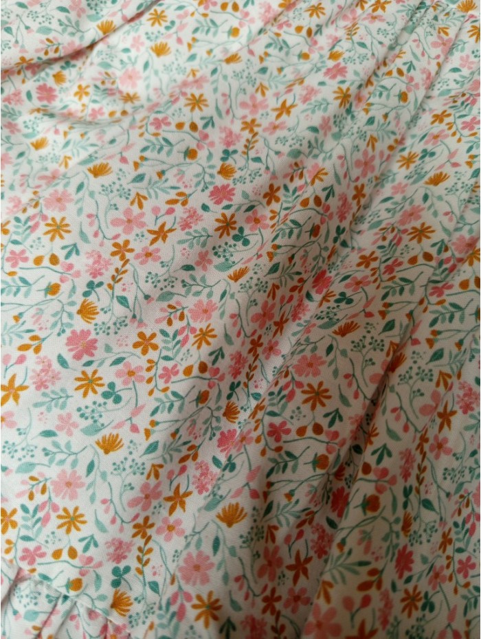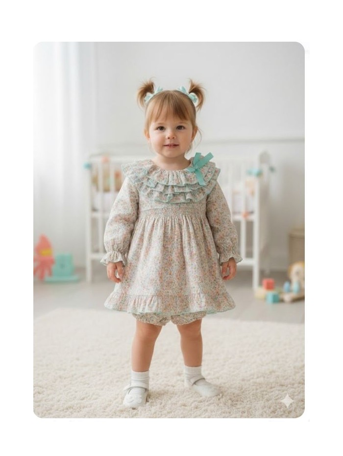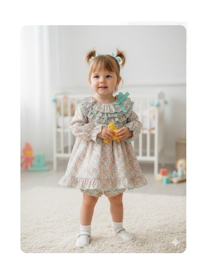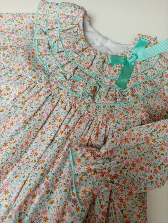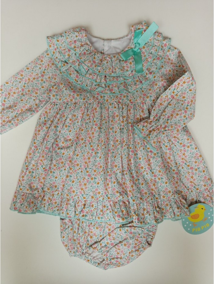 Jesusito, vestido con braga a juego, tejido de algodón estampado floral en tonos verde agua y tostado de la firma Pio pio