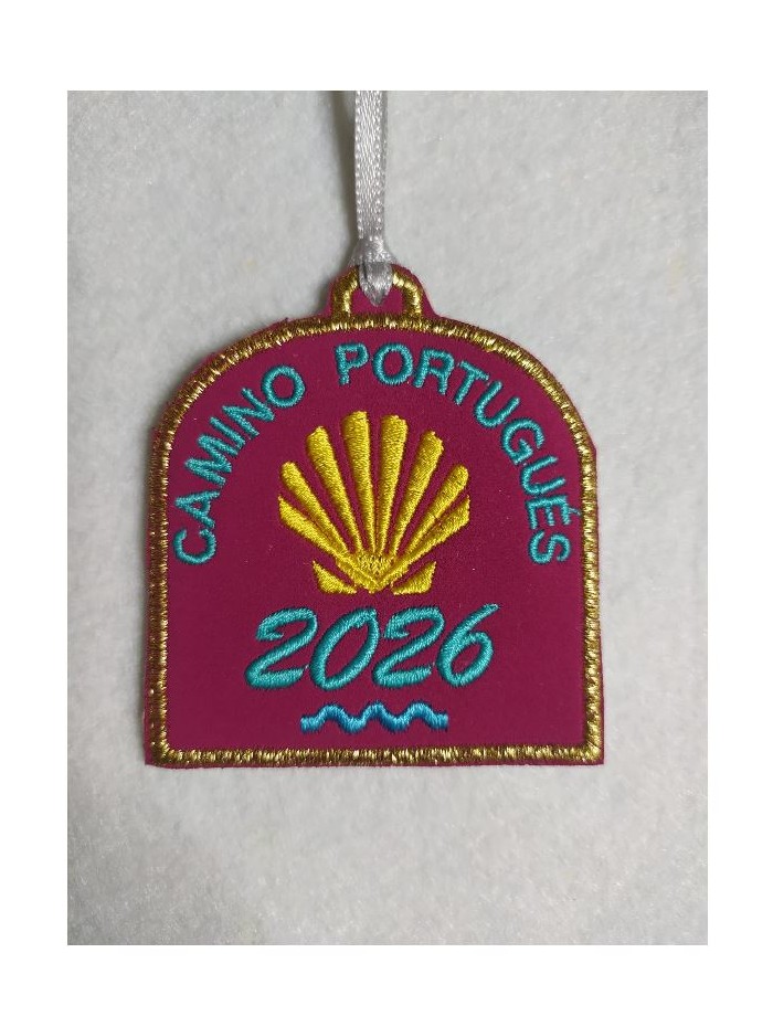 Parche bordado sobre fondo rosa con borde dorado , concha peregrino camino portugués, para coser o colgar con cinta