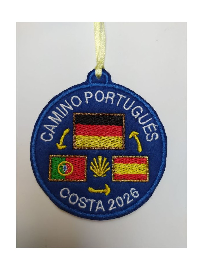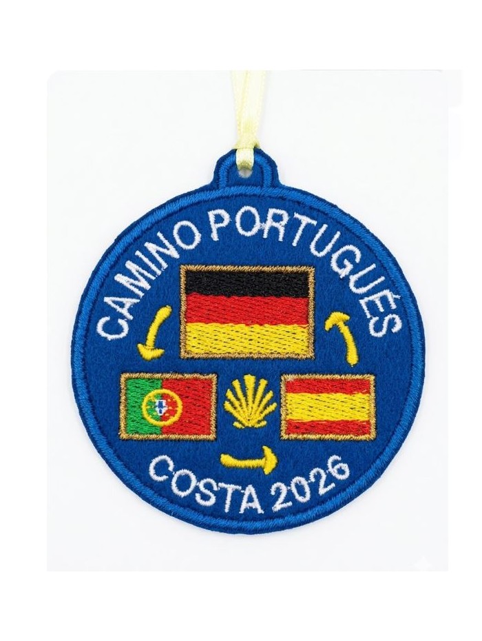 Parche bordado sobre fieltro azul para coser o colgar. Ruta camino de Santiago Portugués por la costa. Con año para personalizar y banderas de Alemania España y Portugal. Parte trasera con forro