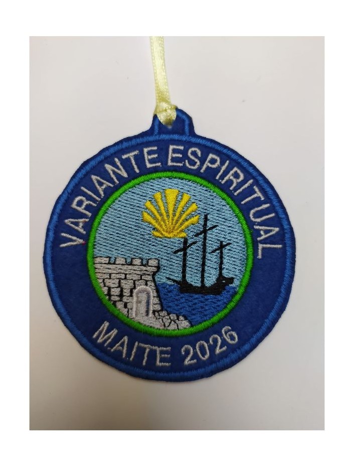 Parche bordado sobre fieltro azul para coser o colgar con cintra, parte trasera con forro