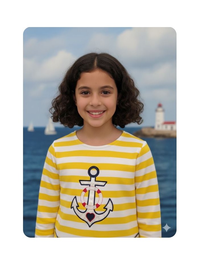 Sudadera marinera para niña, rayas amarillas con bordado ancla.
