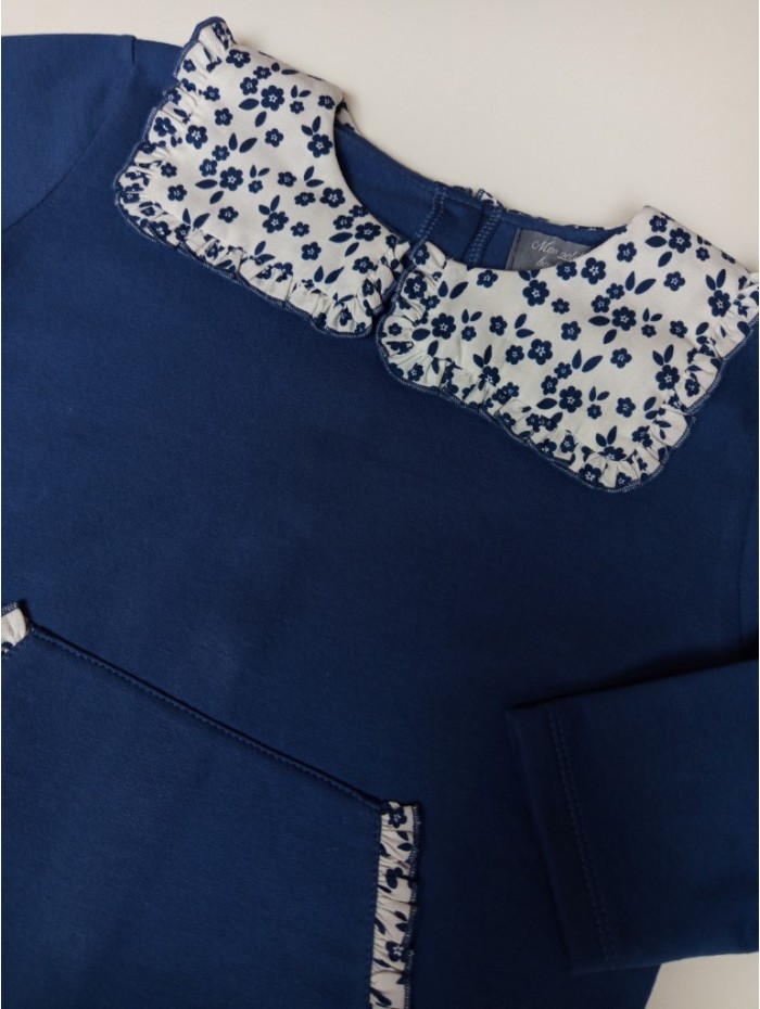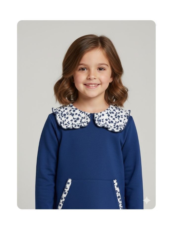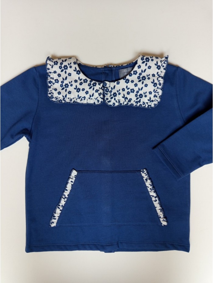 Sudadera niña de felpa azul con cuello cuadrado y bolsillo canguro de la firma Mon petit bonbon