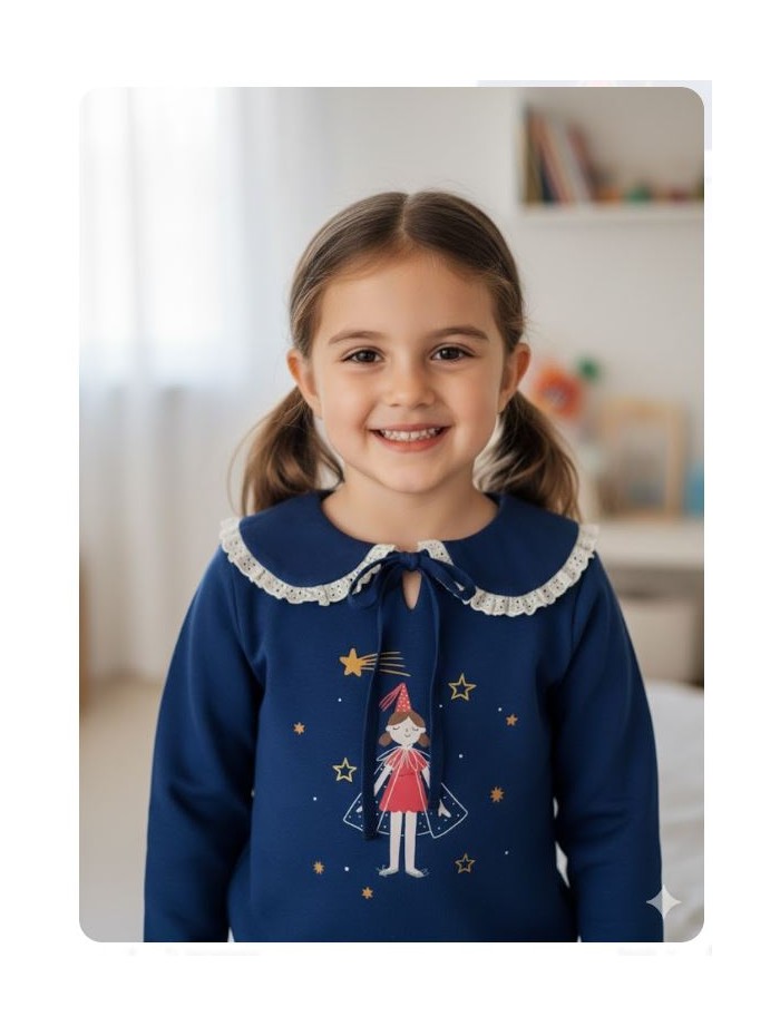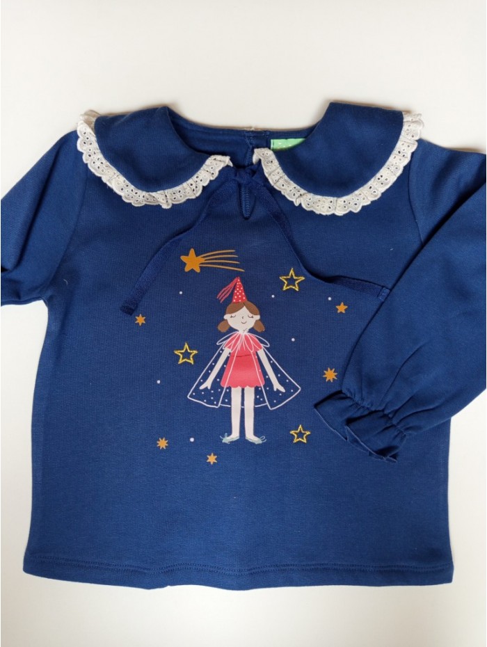 Sudadera para niña confeccionada con tejido de felpa algodón en tono azul, sobre el pecho estampación de hada y pequeñas estrellas doradas bordadas. Cuello bebe adornado con puntilla, puño con elástico , cierre en la espalda con botones. Fabricada en España por la firma de moda infantil Pio pio