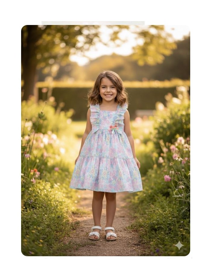 Vestido de verano para niña, corte bajo el pecho con falda en dos partes con vuelo. Escote cuadrado adornado con volantes sobre los hombros, detalle de lazos al tono. Fino tejido estampado con pequeñas flores multicolor donde predomina el tono rosa y azul