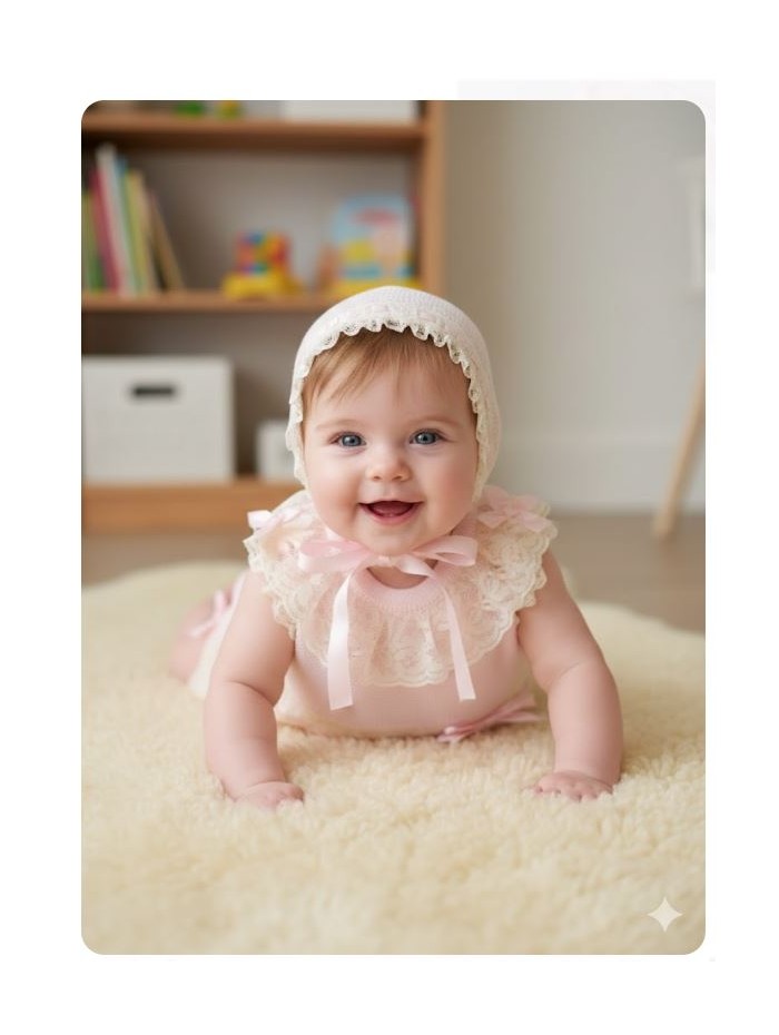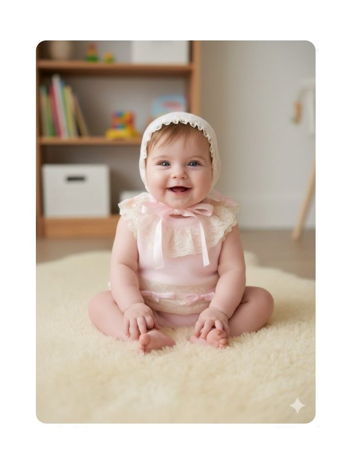 Conjunto de punto en tono rosa para bebe compuesto por jubon braga y capota, adornado con finos encajes en tono marfil y lazos de raso. Cierra en la espalda con botones, braga con cintura elástica