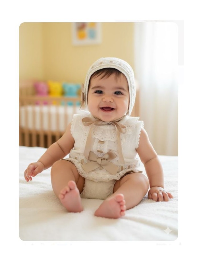 Conjunto para bebe compuesto por jersey braga y capota de punto en tono marfil, adornado con lazos de raso en tono tostado y finos encajes.