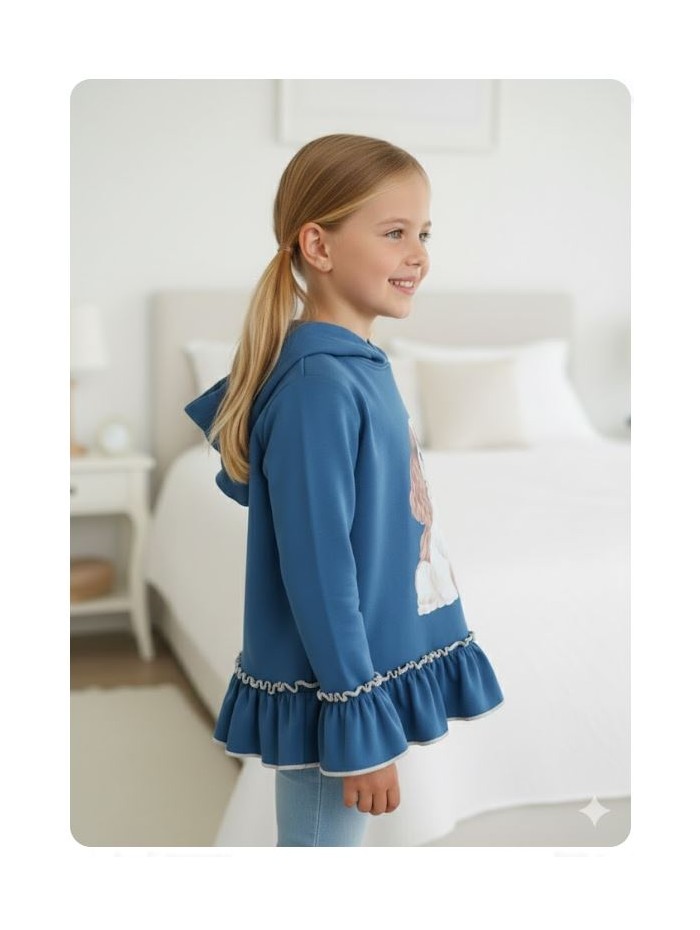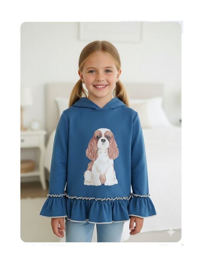 Confeccionada con suave tejido de felpa azul, sobre el pecho estampación de perro coker, capucha con cintas en el escote , en el bajo y los puños volante rematado con filo mafil.