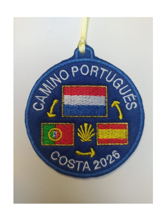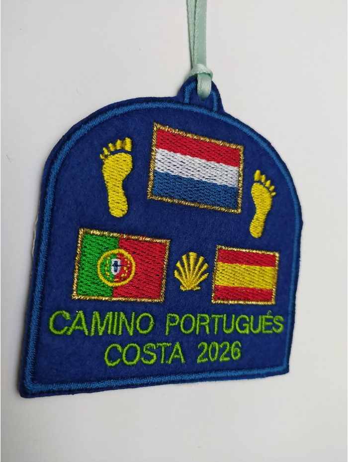 Embroidered patch on blue felt for sewing or hanging. Portuguese Coastal Route of the Camino de Santiago. Includes a year for personalization and the flags of the Netherlands, Spain, and Portugal. Lined back.