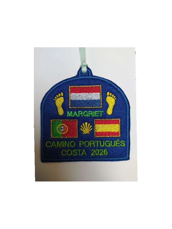 Embroidered patch on blue felt for sewing or hanging. Portuguese Coastal Way of St. James route. With year and name for personalization. Flags of the Netherlands, Spain, and Portugal. Lined back.