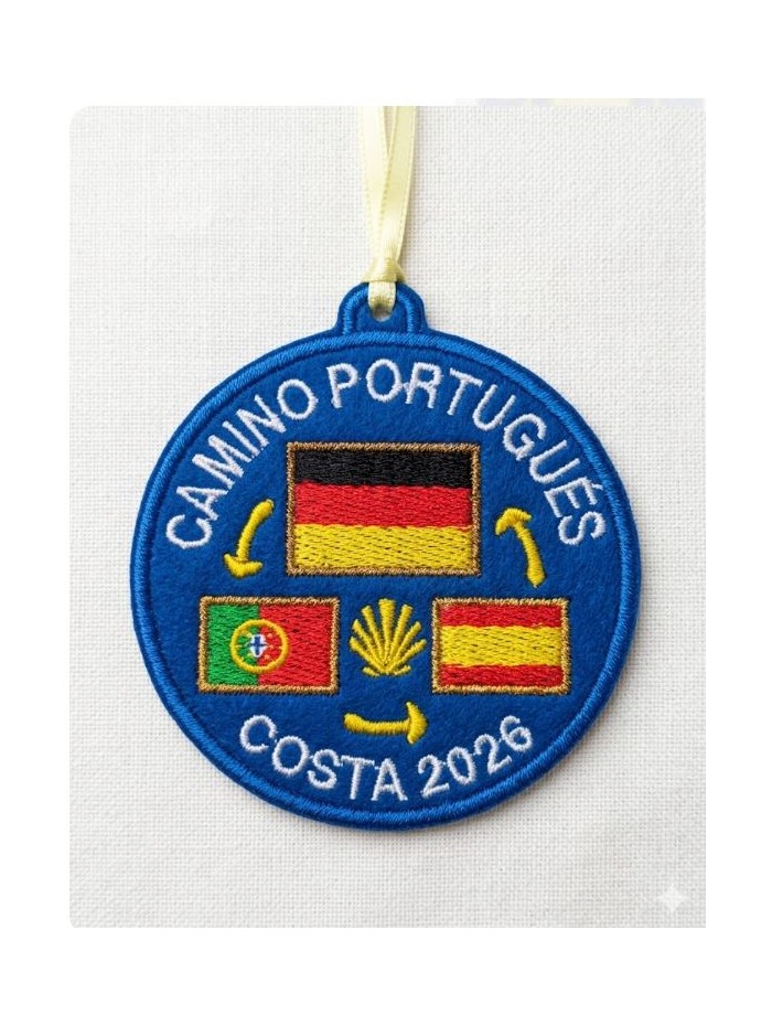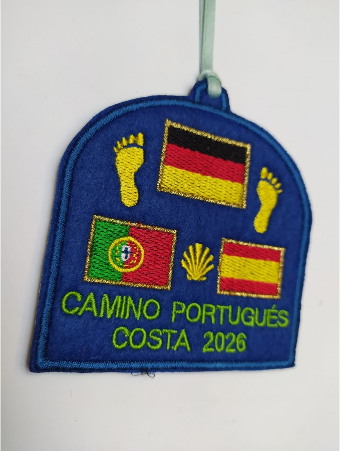 Embroidered patch on blue felt for sewing or hanging. Portuguese Coastal Route of the Camino de Santiago. Includes a year for personalization and the flags of Germany, Spain, and Portugal. Lined back.
