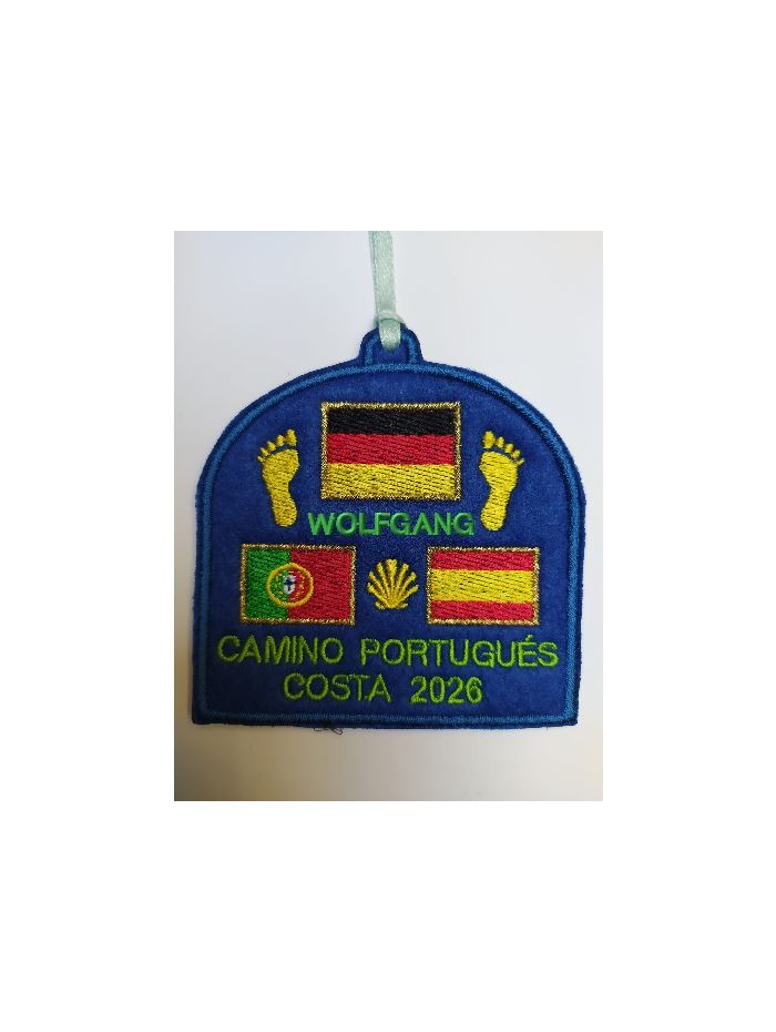 Embroidered patch on blue felt for sewing or hanging. Portuguese Coastal Route of the Camino de Santiago. Includes a year for personalization and the flags of Germany, Spain, and Portugal. Lined back.