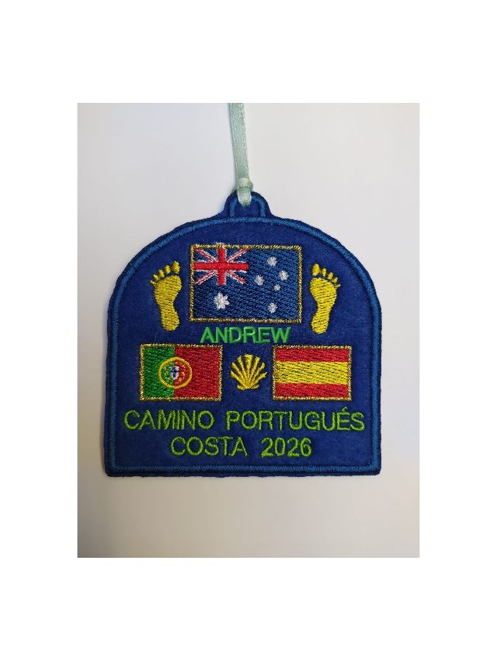 Embroidered patch on blue felt, for sewing or hanging with ribbon. Portuguese Coastal Way of St. James route. Personalize with your name and year. Flags of Australia, Spain, and Portugal. Lined back.