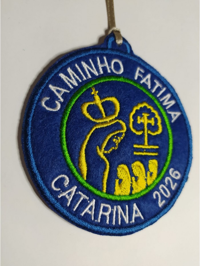 Embroidered patch on blue felt, for sewing or hanging with ribbon. Caminho Fatima design, customizable with the year and your name.