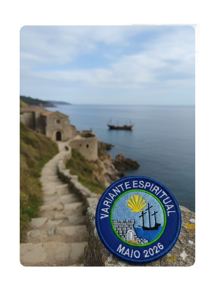Embroidered patch on blue felt, for sewing or hanging with a ribbon; lined back.