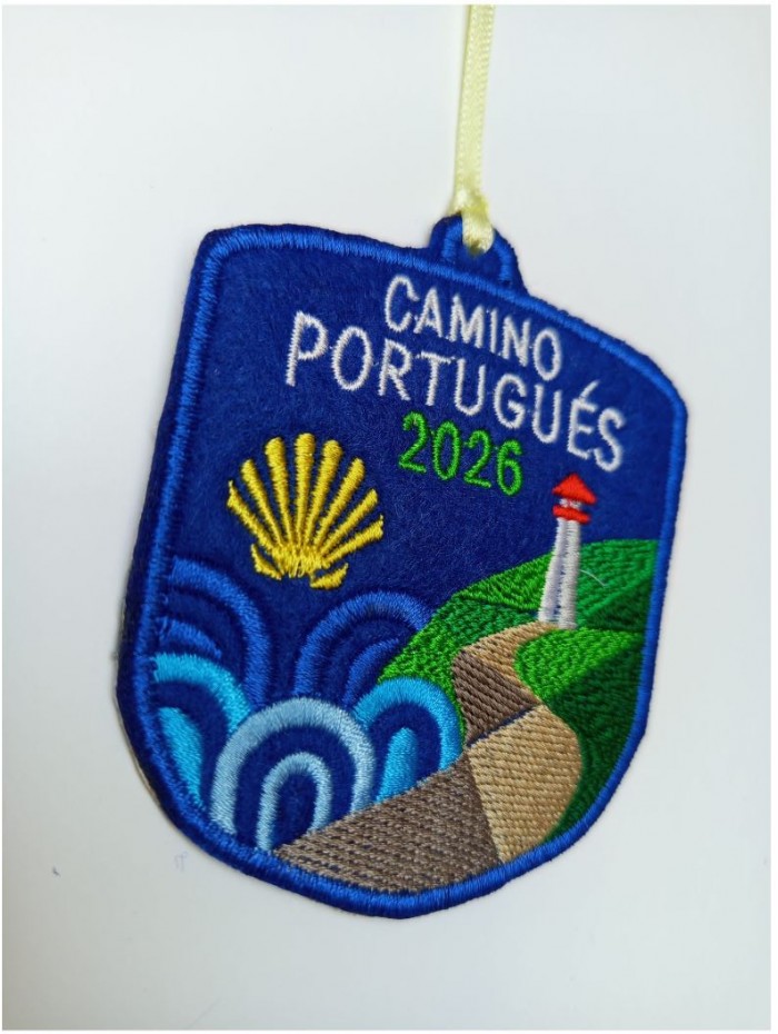 Embroidered patch on blue felt, for sewing or hanging with ribbon. Portuguese Coastal Way to Santiago. Personalized with the year of your pilgrimage.
